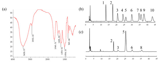 Structural characterization of UPE. (a) FT-IR. (b) Standard monosaccharide. 1-Man, 2-Rha, 3-GlcA, 4-GalA, 5-Lac (internal standard), 6-Glc, 7-Gal, 8-Xyl, 9-Ara, 10-Fuc. (c) Monosaccharide composition of UPE. 2-Rha, 3-GlcA, 5-Lac (internal standard), 6-Glc, 8-Xyl.