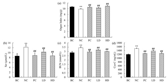 Effect of UPE on organ index and serum Scr, BUN, and Cys-C levels. (a) Organ index. (b) Scr content. (c) BUN content. (d) Cys-C content. The data are expressed as mean ± standard deviation (n = 9). ** p < 0.01 compared with BC group; ## p < 0.01 compared with NC group. BC: blank control, NC: negative control, PC: positive control, LD: low-dose UPE (50 mg/kg), HD: high-dose UPE (300 mg/kg).