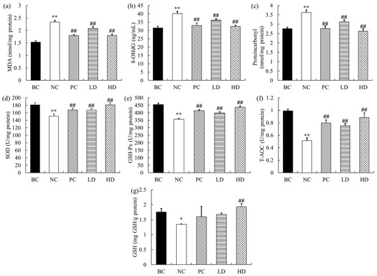 Levels of antioxidant indexes in the kidney of mice. (a) MDA content. (b) 8-OHdG concentration. (c) Protein carbonyl content. (d) SOD activity. (e) GSH-Px activity. (f) T-AOC activity. (g) GSH content. Data are presented as mean ± standard deviation (n = 9). * p < 0.05, ** p < 0.01 compared with BC group; ## p < 0.01 compared with NC group. BC: blank control, NC: negative control, PC: positive control, LD: low-dose UPE (50 mg/kg), HD: high-dose UPE (300 mg/kg).