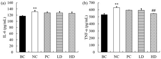 The levels of inflammatory cytokines in mice are shown in Figure 4. Compared with the BC group, the levels of IL-6 and TNF-α in mice injected with D-gal were significantly increased (p < 0.01). The levels of IL-6 and TNF-α in mice in the low-dose group were slightly decreased, but there was no statistically significant difference (p > 0.05). The IL-6 level in the high-dose group showed no significant change, while the TNF-α level significantly decreased.