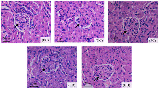 Effect of UPE on histopathological changes of the D-gal-treated kidney. The glomerulus is marked by the arrow. In the NC group, glomeruli are atrophic and deformed, and the renal sac is irregular. The LD and HD groups improved significantly (×400). BC: blank control, NC: negative control, PC: positive control, LD: low-dose UPE (50 mg/kg), HD: high-dose UPE (300 mg/kg).