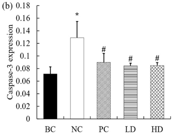 During apoptosis, the caspase-3 protein was positively expressed, and the immunoreactive product was stained in renal tubules. The expression of the caspase-3 protein in the mouse kidney is shown in Figure 6. Apoptosis was observed in each group. Compared with the blank group, caspase-3 showed obvious positive expression in the NC group, and the positive cells were increasingly dense. The positive expression of UPE was significantly reduced in mice after UPE treatment, suggesting that UPE may have a protective effect on apoptosis. Image J software was used to analyze the staining situation, and it was found that compared with the BC group, the protein expression level of the NC group was significantly increased (p < 0.05), and the expression level of caspase-3 decreased significantly after treatment (p < 0.05), which further proved the improvement effect of UPE on apoptosis.