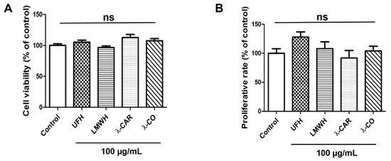 Effects of the four sugars, Unfractionated Heparin (UFH), Low Molecular Weight Heparin (LMWH), native λ-Carrageenan (λ-CAR), and depolymerized λ-CAR (λ-CO) on parental MDA-MB-231 cell viability and proliferation rate. (A) MTT assay was used to analyse cell viability of cells treated with vehicle (control) or compounds at 100 µg/mL for 24 h. (B) Cells were counted after 24 h treatment with either vehicle (control) or compounds at 100 µg/mL. Values are the mean ± SEM of three independent experiments. ANOVA followed by post hoc Fisher’s LSD test. ns: non-significant. Control: parental MDA-MB-231 cell line.