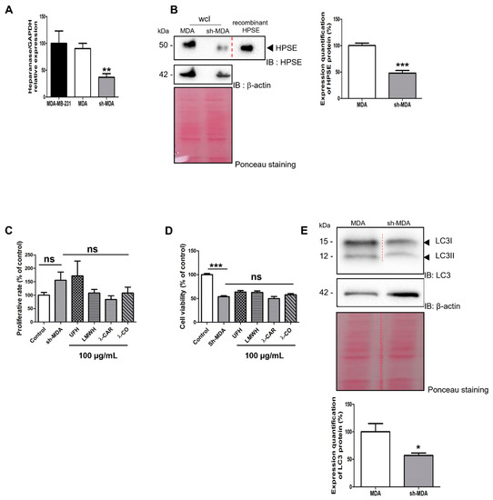 Effects of the four sugars on sh-MDA cells. (A) Analysis by RT-qPCR of HPSE gene expression 48 h after transfection of MDA-MB-231 (parental cells); MDA: transfected with a scramble shRNA; sh-MDA: transfected with sh-RNA against HPSE. (B) WB analysis of HPSE levels on MDA and sh-MDA cells and the corresponding quantifications normalised with β-actin. wcl: whole cell lysates. (C) Effects of the compounds on proliferation rate. sh-MDA cells were counted after treatment with either vehicle (control) or compounds at 100 µg/mL for 24 h. (D) MTT assay was used to analyse cell viability of sh-MDA cells treated with vehicle (control) or treated with compounds at 100 µg/mL for 24 h. (E) WB analysis of LC3 levels in MDA compared with sh-MDA and the corresponding quantifications normalised with β-actin. Ponceau S staining is shown as loading control. Values are the mean ± SEM of three independent experiments. *: p < 0.05; **: p < 0.01; ***: p < 0.005; ns: non-significant. ANOVA followed by post hoc Fisher’s LSD for (A,C,E); Student t test for (B). IB: immunoblot.