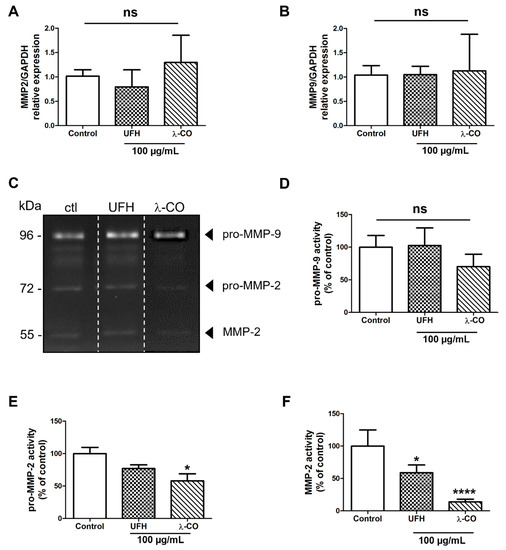 Analyses of the expression of MMP2 (A) and MMP9 (B) by RT-qPCR after 24 h treatment of MDA cells by UFH and λ-CO at 100 µg/mL. (C) Gelatin gel zymography images. Analyses of the activity of pro-MMP-9 (D), pro-MMP-2 (E), and MMP-2 (F) after 24 h treatment of UFH and λ-CO at 100 µg/mL. The white dotted line in C indicates splicing of non-adjacent lanes in the same zymogel. Data are shown as the mean ± SEM of three independent experiments. Values are the mean ± SEM of three independent experiments. * p < 0.05; **** p < 0.001; ns: non-significant, ANOVA followed by post hoc Fisher’s LSD. Ctl: Control: MDA cells untreated. ns: non-significant.
