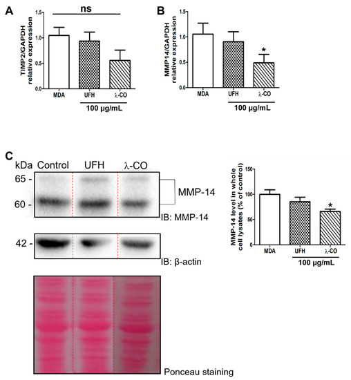 Analysis of the expression of TIMP2 (A) and MMP14 (B) encoding genes by RT-qPCR after treatment of MDA cells by UFH and λ-CO at 100 µg/mL for 24 h. (C) Analysis of MMP-14 levels in whole cell lysates after treatment of UFH and λ-CO at 100 µg/mL and the corresponding quantifications normalised with β-actin. The red dotted line indicates splicing of non-adjacent lanes in the same WB. Ponceau S staining is showed as the loading control. Data are shown as the mean ± SEM of three independent experiments. Values are the mean ± SEM of three independent experiments. * p < 0.05; ns: non-significant ANOVA followed by post hoc Fisher’s LSD. Ctl: Control: MDA cells untreated. IB: immunoblot.