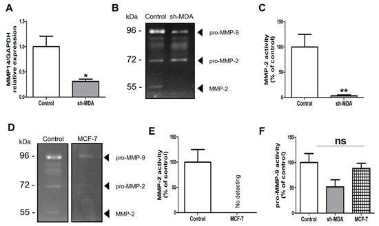 (A) Analysis of the expression of MMP-14 encoding gene by RT-qPCR on sh-MDA cells. (B) Gelatin gel zymography images and (C) Quantification of MMP-2 activity on MDA cells (control) compared to sh-MDA cells. (D) Gelatin gel zymography images showing level of MMP-2 in MDA cells compared to MCF-7 cells. (E) Quantification of MMP-2 activity on MDA cells (control) compared to MCF-7 cells. (F) Quantification of pro-MMP-9 levels in MDA cells (control) compared to sh-MDA and MCF-7 cells. Data are shown as the mean ± SEM of three independent experiments. Values are the mean ± SEM of three independent experiments. *: p < 0.05; **: p < 0.01. Student t test for (A,C). Control: MDA cells untreated. ns: non-significant. ANOVA followed by post hoc Fisher’s LSD for (F).