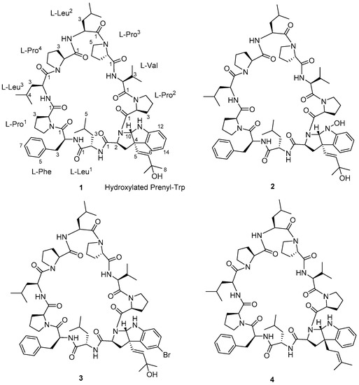 - Parajuli, A.; Kwak, D.H.; Dalponte, L.; Leikoski, N.; Galica, T.; Umeobika, U.; Trembleau, L.; Bent, A.; Sivonen, K.; Wahlsten, M.; et al. A unique tryptophan C-prenyltransferase from the kawaguchipeptin biosynthetic pathway. Angew. Chem. Int. Ed. Engl. 2016, 55, 3596–3599. [Google Scholar] [CrossRef] [Green Version]