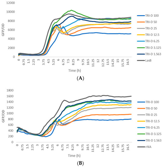 Dose response curves of trikoramide D (3) when incubated with P. aeruginosa PAO1 lasB-gfp (A) and rhlA-gfp (B) bioreporter strains.
