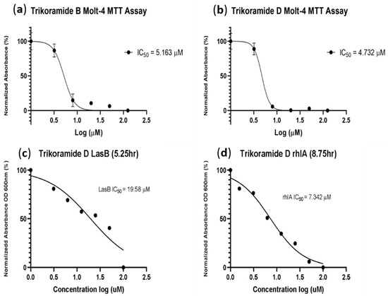 (a,b) showing log concentrations (µM) of trikoramides B (1) and D (3) against normalized absorbance (%); (c,d) for the MTT assay performed on MOLT-4 human leukemia cell line and quorum-sensing inhibitory assay based on P. aeruginosa PAO1 lasB-gfp and rhlA-gfp bioreporter strains.