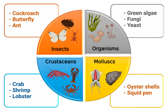Chitin (β-(1→4)-poly-N-acetyl-D-glucosamine) is the second most abundant long-chain aminopolysaccharide polymer occurring in nature after cellulose and was first identified in mushrooms in 1811 [4,16]. Although chitin provides strength to the cell wall of some fungi, it is present in the cuticles or exoskeletons of insects, arthropods, mollusks and is mainly isolated from crustaceans, including crab, lobster, crayfish, king crab, and shrimp (Figure 3). For biomedical applications, chitin in the solid-state can be converted through enzymatic or chemical deacetylation to its most well-known fibrous substance derivative, chitosan [3].