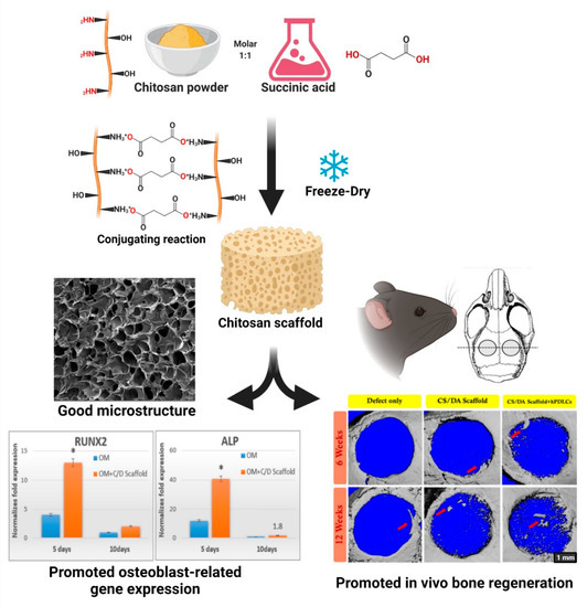 Up to date, it has been stated that chitosan has demonstrated very good osteoconductivity, it allows obtaining desirable shapes easily, promotes osteogenic differentiation and mineralization, and prevents inflammatory response or inflammation reaction [28,29,30]. These properties make chitosan an attractive candidate to use as a scaffold sponge for regenerative bone therapy and orthopedic applications. Our team has developed a novel chitosan scaffold fabrication technique using multifunctional carboxylic acid instead of dialdehyde as a crosslinker [31]. Dicarboxylic acids, especially succinic acid, displayed dual functions, protonation for chitosan powder dissolution and crosslinking via amide bond via a conjugating reaction. This method has fewer steps and is an environmental fabrication technique compared with the conventional technique. The in vitro characterization revealed that the chitosan scaffold had appropriate physicochemical properties, mechanical properties, and biocompatibility. Moreover, this novel scaffold can serve as a template for human periodontal ligament cell seeding and enhanced in vivo bone regeneration in a mouse calvarial defect model [32]. These findings strongly suggest that the chitosan scaffold is an appropriate material for use in BTE (Figure 6).