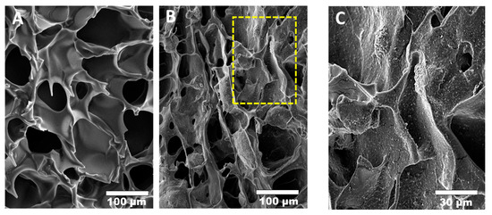 The precipitation of calcium and phosphate ions on the surface of the chitosan scaffold. (A) pure chitosan scaffold; (B) chitosan/BCP scaffold; (C) high magnification of B.