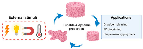 A new generation of BTE scaffolds seeks to further improve bone regeneration ability through the development of a “smart” scaffold, which is defined as a new class of scaffold that actively respond to external or internal stimuli such as mechanical forces, magnetic forces, temperature, pH levels, electrical fields, and enzymes, leading to a change in their shape, volume, or physical structure (Figure 8). Smart scaffolds can display adaptable and dynamic properties, allowing the researcher to manipulate scaffold properties in the desired direction [56,57]. These new generation of chitosan scaffolds are primarily employed in the field of BTE as an active appliance for precision drug or stem cell delivery and shape memory polymers (SMP) [57]. For example, Nafee et al. reported the development of chitosan-based hydrogels, which deliver bone resorption inhibitor alendronate. The hydrogel showed thermoresponsive ability and controlled drug release over 45–65 days with less inflammation and faster maturation of granulation tissue [58]. Shape-memory polymer is one of the stimuli-responsive polymers which can change their shape, size, and mechanical properties with the activation of external stimuli [59]. Hu et al. developed poly (lactic acid-co-trimethylene carbonate)/chitosan composite scaffold which have thermo-responsive property. They showed it rapidly recovered its original shape when stimulated with body temperature (within 5 minutes). Moreover, the composite scaffolds exhibited excellent biocompatibility and enhanced adhesion of MC3T3-E1 cells [60]. Fu et al. developed a chitosan/polyurethane cryogel scaffold that possesses switchable shape-memory property. In 4 °C water, this scaffold recovered its original shape, while in 37 °C water, it transformed to a long strip shape [61]. In summary, the shape-memory chitosan scaffold represents a potential use for BTE and minimally invasive bone surgery. Combining 3D printing technology with smart scaffolds has created a promising research field known as four-dimensional (4D) bioprinting. The 4D bioprinting scaffold possesses the dynamic ability to change its shapes under stimuli and adapt to the native microenvironments of the bone defect [62]. For example, Seo and coworkers used 4D printing technology to create a hydroxybutyl methacrylated chitosan scaffold. The results showed that the scaffolds have the thermoresponsive ability and tunable physicochemical properties according to temperature [63]. Indeed, new generation smart chitosan-based scaffolds display excellent ability for improved outcomes of bone regeneration.