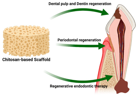 Schematic representation of applications of chitosan-based scaffolds in regenerative dentistry.
