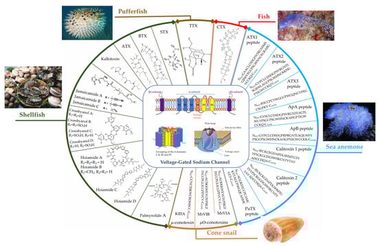 Voltage-gated sodium channels (VGSCs) have been the topic of significant research and discussion for a considerable amount of time given their unique functions in electrical cell signaling. In 1952, Hodgkin and Huxley were the first to establish the existence of VGSCs and their crucial role in the generation of action potentials (APs) for which they won the Nobel Prize in 1963 [1,2]. VSGCs are activated by membrane depolarization, resulting in a fast and temporary Na+ influx before an intracellular loop quickly closes the pore [3]. These channels are very important for homeostasis, thus some genetic abnormalities in VGSC genes can result in a varied range of disorders known as "channelopathies" [4] such as muscle, cardiac, and neurological disorders [5]. Moreover, because of their ability to bind local anesthetics, VGSCs are the major target to treat different types of pain [6]. These ion channels are pharmacologically validated molecular targets for a large panel of clinically used drugs, such as antiarrhythmics, anticonvulsants, anesthetics, and analgesics [7]. Researchers have studied many pharmacological agents, including marine neurotoxins, to develop treatments for VGSC-related disorders and pain-relieving drugs. Neurotoxins produced by marine animals or microorganisms can bind to VGSCs at different sites, resulting in either activation or inhibition of the channel [2]. These toxins such as tetrodotoxin (TTX) and saxitoxin (STX), two pore-blocking toxins, have significantly improved our comprehension of the VGSCs function and structure [8]. Hence, this review aims to provide an overview of the main toxins produced by venomous marine animals and microorganisms that act on VGSCs and examine their pharmaceutical potential in the management of pain and some diseases.