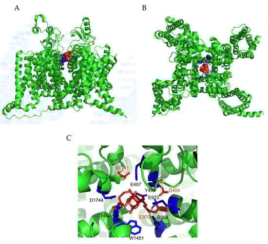 Interaction of TTX with Nav1.7 channel. Docking model of TTX-Nav1.7 channel interaction resolved by CryoEM (pdb code 6J8I, [31]). Nav1.7 channel is displayed as a cartoon, while TTX is shown as spheres. (A) Profile view; (B) top view. (C) Close-up showing the TTX-binding site within the pore. Lateral chains of amino acids interacting with TTX are labeled. In red are the amino acids that form the selective filter (DEKA). TTX is shown in the center of the pore in stick. The figures were prepared with PyMOL (DeLano W.L. (2010) The PyMOL Molecular Graphics System, version 1.6, Schrodinger, LLC, New York, NY, USA).