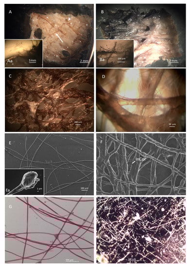 Microscopy analysis of fresh slices of I. oros and S. foetidus tissues showed their organic skeleton anatomy, articulated in a combination of main branched brown structures, commonly known as spongin, on which thin and clear filaments are tightly enveloped. With slight pressure on a free edge of the tissue, these filaments can be observed to emerge from the spongin’s main branch (Figure 1A,Aa,B,Ba).