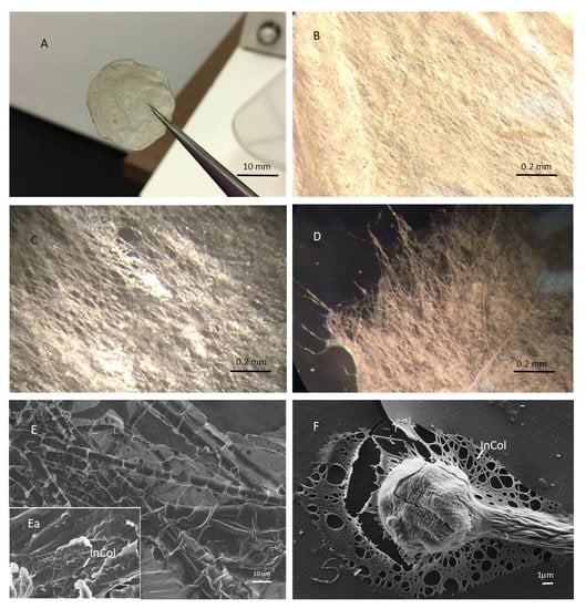 S. foetidus-derived membranes morphology. (A) Photograph of whole S. foetidus-derived membrane. (B) Micrographs showing the jagged edge of the S. foetidus-derived membrane. (C–F) Scanning electron microscopy analysis showing the texture of the S. foetidus-derived membranes. InCol: intercellular collagen fibres.