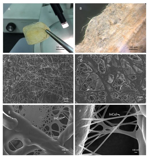 Porifera is an extremely rich and biodiverse phylum, with more than 6,500 different species described to date []. These simple sessile animals are characterised by various shapes and textures supported by different structural solutions. Many species are characterised by a mineral skeleton made of silica or calcium carbonate, while others, commonly designated as keratose or horny sponges, have bodies formed exclusively by a flexible fibrous proteinaceous material commonly referred to as spongin [,]. The chemical-physical analyses of the abovementioned “spongin” lead back to a collagenic nature [,], but the co-presence of intercellular collagen fibres of smaller diameter in the same animals requires a better definition and characterisation of the various structures of collagen origin present in these sponges. Conventionally, the insoluble fibrous material isolated from the horny sponges after cell elimination by enzymatic treatment and centrifugation at low speed is designated as spongin B, while the collagenous suspension that can only be recovered through long and high-speed centrifugations is considered spongin A, or more generally, the sponges’ intercellular collagen fibres []. A third sponge collagenic material was furthermore found only in members of the Irciniidae family: peculiar collagen filaments intimately connected to the fibrous spongin matrix, forming a single extremely robust and flexible support unit, specifically described in the two genera, Ircinia and Sarcotragus [,]. Their function remains controversial. Previously, some studies have also advanced the hypothesis of structures acquired by parasites []. However, their detailed morphological and chemical-physical characterisation confirmed the collagenic nature of these structures [], attesting to their function as a skeleton specialisation typical of these genera. Depending on the species, the size of these filaments varies from a few millimetres in length to a few microns, and, in most cases, they end with an ovoid knob. Their ultrastructural analyses show that they are composed of tightly connected sets of collagen fibrils, often containing iron hydroxide granules of Lepidocrocite (γ-FeO(OH)) [], whose function remains unknown. Unlike spongin, these filaments are surrounded by a thin amorphous cuticle whose positivity to Alcian blue strongly suggest the presence of carbohydrate components. This overall organisation shapes the tight packaging of the collagen fibrils composing the filaments, and it confers them as a relevant resistance to enzymatic digestion []. Ultimately, these peculiar structural features of horny sponge filaments represent something unique of their kind, and in our opinion they could have in principle relevant characteristics as a raw material for the production of 3D composites [], as well as new devices for regenerative medicine.