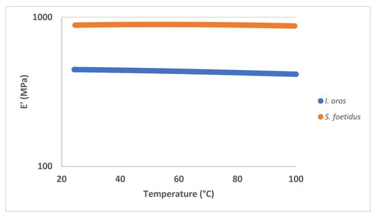 Mechanical test of SCFMs. DMTA spectra of I. oros-derived (blue curve) and S. foetidus-derived (orange curve) membranes measured in extensional configuration with a frequency of 1 Hz and an extensional stress of 0.1 MPa.