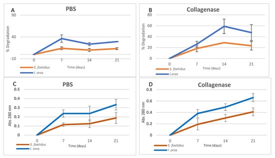 The degradation rate of SCFMs in PBS or collagenase solution was first investigated by evaluating the percentage of weight loss as a function of the degradation time. The percentage weight loss of SCFMs within 21 days in PBS (pH 7.4) is shown in Figure 7A. For each membrane type, the main weight loss was detected within seven days, while insignificant weight loss was observed after 14 and 21 days. After seven days, I. oros-derived membranes exhibited a weight loss rate of 36.27 ± 8.54%, while in S. foetidus types, the weight loss was 13.9 ± 3.25%, which was more stable than I. oros-derived membranes.