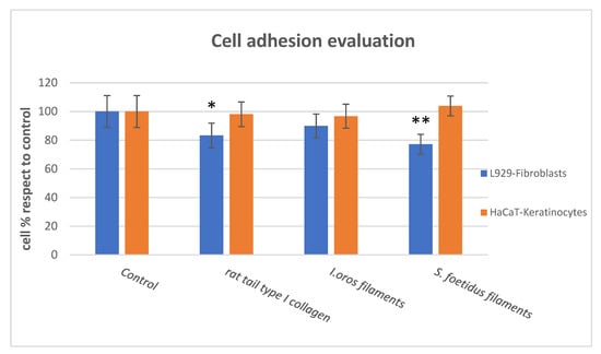 Cell adhesion evaluation. Cell adhesion quantitative evaluation, by MTT test, of L929 fibroblasts (blue bars) and HaCaT keratinocytes (orange bars) on the rat tail type I collagen, I. oros collagen filaments and S. foetidus collagen filaments pre-coated plates after 16 h of incubation. Results are expressed as cell percentages with respect to controls that were seeded on uncoated wells and are the mean ± S.D. of three experiments that were performed using eight well for each experimental condition. Statistical analysis results: one-way ANOVA, (blue bars) p < 0.05; (orange bars) p < 0.05. Asterisks indicate a significant difference versus the respective control (paired Tukey test, * p < 0.05, ** p < 0.001).