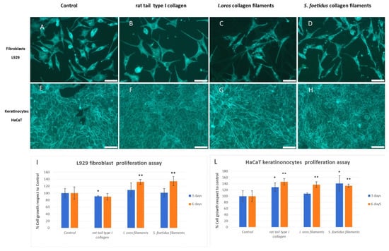 Cell proliferation evaluation. (A–D) Alexa Fluor 488-conjugated phalloindin stained L929 fibroblasts, epifluorescence microscope. (A) In control cells, the fluorescent actin cytoskeleton allows the observation of the typical aspect of fibroblast in culture, with fusiform, elongate shape, some focal adhesion (bright dots) and no preferential direction of cell and processes elongation. (B) Cells with rat tail type I collagen show no shape alteration. (C) I. oros collagen filaments are visible as weakly fluorescent stripes in the background. The fibroblasts clearly interact with the collagen and maintain their overall shape. (D) The thin collagen filaments of S. foetidus are not easily visible through the fluorescent filters; fibroblast have a morphology similar to the control. (E, F) Alexa Fluor 488-conjugated phalloindin stained HaCAT keratinocytes, epifluorescence microscope. (E) In control cells, the fluorescent actin cytoskeleton allows the observation of the organisation of keratinocytes that tend to interact, forming sheets. (F–H) The presence of collagen from rat tail, I. oros and S. foetidus does not induce detectable alterations in the morphology of cultured keratinocytes. Although covered by cells, the presence of collagen filaments of I. oros is detectable as two stripes from top left to the bottom right corner of the G photograph. Scale bars 50 µm. (I–L) Cell viability quantitative evaluation, by MTT test, of L929 fibroblasts (panel I) and HaCaT keratinocytes (panel L) on the rat tail type I collagen, I. oros collagen filament and S. foetidus collagen filament pre-coated plates after 3 days (blue bars) and 6 days (orange bars) of incubation. Results are expressed as cell percentages compared to controls that were seeded on uncoated wells, and are the mean ± S.D. of three experiments that were performed using eight well for each experimental condition. Statistical analysis results: one-way ANOVA, (I, blue bars) p < 0.0001, (I, orange bars) p < 0.0001; (L, blue bars) p < 0.0001, (L, orange bars) p < 0.005. Asterisks indicate a significant difference versus the respective control (paired Tukey test, * p < 0.05, ** p < 0.001).