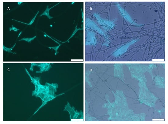 Along with adhesion, in our experimental model, cell viability results are also reported here. The L929 fibroblast viability assay of SCFMs and rat tail collagen coating three and six days after plating is shown in Figure 9 (Panel I). Compared to the control, no significant differences were observed on plates coated with I. oros filaments after three days, while after six days, L929 fibroblasts growth resulted in 132.48 ± 6.83% compared to the control, attesting an improved proliferation rate. Similar results were observed in fibroblasts growing on plates coated with S. foetidus filaments. No difference in cell viability was observed with this biomaterial after three days, in comparison with the uncoated control sample, while after six days, the L929 fibroblast viability on this biomaterial was 134.19 ± 12.82% compared to the control. Conversely, on rat tail collagen coating, the cell viability after three days was 89.74 ± 9.40% compared to the control and no significant differences were registered after six days. Therefore, in our experimental conditions, in regards to the cell growth induction, SCF coating was more effective for fibroblast cell lines than mammalian collagen coating. Micrographs of the phalloidin-stained L929 fibroblasts growing on I. oros and S. foetidus collagen filaments, respectively, are shown in Figure 9A,B. After 24 h, their shape and their interaction with the biomaterials were very similar to the cell morphology observed in the controls and cells plated on rat tail collagen (Figure 9A,B, respectively). Figure 9 also shows the HaCaT keratinocytes proliferation assay (Panel L). Here, no significant differences in viability were detected on I. oros collagen filament coatings three days after plating, while after six days a significative increase in viability was observed (137.18 ± 8.97%), compared to the control. On S. foetidus collagen filament coatings, cell growth of 141.25 ± 24.61% and 133.33 ± 5.10% was registered after three and six days, respectively, compared to their controls. Similarly, in the rat tail collagen coating, a cell viability of 129.23 ± 13.85% and 146.15 ± 10.26% was measured after three and six days, respectively. Therefore, despite different temporal kinetics, SCF coatings are also able to promote in vitro cell proliferation of keratinocytes similar to that observed in mammalian collagen coatings. The phalloidin-stained HaCaT keratinocyte cells growing on I. oros and S. foetidus collagen filaments are shown in Figure 9G,H, respectively. As previously shown for fibroblasts, no significant morphology variations were observed compared to the control and rat tail coating samples (Figure 9E,F, respectively). Similar to what has been previously reported for spongin structures [], the I. oros filaments emitted weak green autofluorescence, and this peculiar histological property, combined with their large size, allows a detailed observation of how both the fibroblasts and keratinocytes are intimately associated with the biomaterial and their prolongations (Figure 9C,G). In Figure 10, the way that the cell extensions faithfully follow the filaments’ shape can be observed in detail at a higher magnification (Figure 10A,C). Different to I. oros, S. foetidus filaments do not emit autofluorescence, but by superimposing the images obtained with fluorescence and light microscopy, it is still possible to observe that even with this biomaterial, both the fibroblasts and the keratinocytes are closely associated with the filaments, and their cell body often follows the filaments’ direction (Figure 10B,D). Together these data show us that regardless of their size or the presence of iron biomineral coverage, both sponge-derived collagen filaments exhibited good biocompatibility, and can improve fibroblast and keratinocytes proliferation. Furthermore, the direct cell surface interactions with these marine biomaterials and their ability to drive the cell growth direction along their structure are extremely suitable to guided tissue regeneration (GTR) applications [].