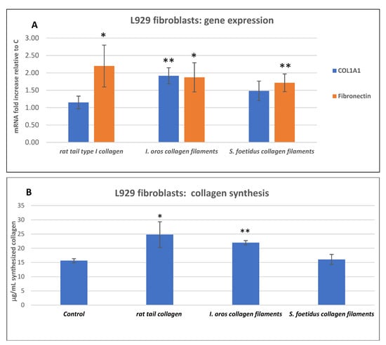 Gene expression profile of ECM production-related genes and fibrillar collagen expression level analysis in L929 fibroblast growing on SCMs. (A) qPCR evaluation of type I collagen (COL1A1) and fibronectin gene expression (blue and orange bars, respectively) in L929 mouse fibroblasts growing 24 h on wells precoated with rat tail type I collagen, I. oros collagen filaments and S. foetidus collagen filaments. Data are expressed as fold increase relative to the control (uncoated wells) and normalised to GAPDH gene. Each bar represents the mean ± S.D. of two independent experiments performed in triplicate. (B) Fibrillar collagen synthesis quantification measured using the Sircol colorimetric method as described in Section 4.8.4 of L929 fibroblast growing 48 h on uncoated wells (control) or precoated with rat tail type I collagen, I. oros collagen filaments and S. foetidus collagen filaments. Statistical analysis results: one-way ANOVA, (A) p < 0.005; (B) p < 0.001. Asterisks indicate a significant difference versus the respective control (paired Tukey test, * p < 0.05, ** p < 0.001).