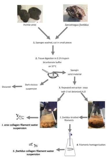 Frozen sponges were extensively washed in running tap water to remove sand residues, and finally washed with distilled water. The sponge tissues were minced in small pieces with scissors and enzymatically digested, as previously described []. The flowsheet of the extraction procedure is shown in Scheme 1. A total of 20 g of cut sponge tissues were treated with 0.1% trypsin in 100 mL of ammonium bicarbonate, pH 8.5, overnight at 37 °C on a horizontal shaker. Subsequently, the dark fluid was removed by filtration with a metallic strainer, and the solid material was suspended in three volumes of cool deionised water and incubated at 5 °C for three days in a rotary disc shaker aliquoted in 50 mL tubes.
