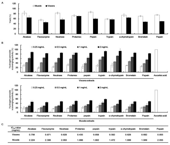 Extraction yields and hydrogen peroxide (H2O2) scavenging activities of Turbo cornutus extracts. The extraction yields (A), H2O2 scavenging activities (B), and IC50 values (C) of each T. cornutus viscera and muscle enzyme-assisted extract. (C) IC50 values on H2O2 scavenging activities of Turbo cornutus extracts.