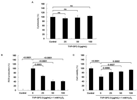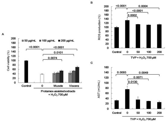 ), superoxide anion (O2−), singlet oxygen (O2), and H2O2 (H2O2) []. ROS react with molecules by reversible oxidative modifications and factors in cellular signaling pathways, such as metabolism, growth, differentiation, and death signaling []. However, ROS overproduction without control can result in oxidative damage to cell structures, including lipids and membranes, proteins, and DNA [,]. Therefore, the MTT assay was performed in H2O2-exposed HepG2 cells to evaluate the potential antioxidant effect of viscera and muscle extract s. As shown in Figure 2, significant cell death was observed in the H2O2-treated cells. However, TVP and the muscle protamex extract markedly increased cell viability. Especially, TVP showed a higher protective effect than did muscle protamex-assisted extracts against H2O2 in HepG2 cells. In addition, TVP inhibited intracellular ROS production, and aspartate aminotransferase (AST) levels increased by treating H2O2 in HepG2 cells. These results indicated that T. cornutus viscera tissues possess a high value than did T. cornutus muscle tissues by protamex-assisted hydrolysis processing.