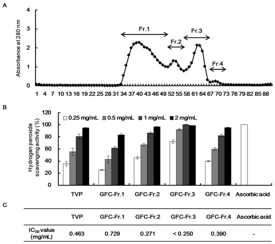 Hydrogen peroxide (H2O2) scavenging activities of Turbo cornutus viscera protamex extract gel filtration chromatography fractions. (A) Gel filtration chromatogram of T. cornutus viscera protamex extracts using Sephadex G-25. H2O2 scavenging activities (B) and IC50 values (C) of each fraction.