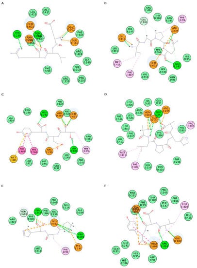 4-ABH is one of hydrazide with the formula H2NC6H4C(O)NHNH2 containing two amino groups and benzene ring. 4-ABH is docking to the active site of MPO with hydrogen bond and pi bond between the amino groups and benzene ring. Among the bioactive peptides, TDY and FAPQY having a benzene ring bound to MPO, with low binding energy of −368.111 and −387.049 kcal/mol, respectively. The top hit docking poses were presented as two-dimensional (2D) diagrams and three-dimensional (3D) to confirm the biological network dynamics of the complexes (Figure 5 and Figure 6). MPO was expressed as a line model, and the active site including a heme group (green part), was expressed as a thin stick model (Figure 6). TDY (Figure 6A) and FAPQY (Figure 6B) was shown as a gray and red stick model. The complexes displayed favorable hydrogen bond interactions, with the pink section as a donor and the green section as an acceptor (Figure 6A,B). The docking of TDY was performed through interaction with the active site, including a heme group and PHE99, THR100, GLU102, ARG239, GLU242, PHE366, PHE407, and MET411 (Figure 5C and Figure 6A). In addition, the docking of FAPQY was performed through interaction with the active site, including a heme group and HIS95, THR100, GLU116, ARG239, and GLU242 (Figure 5I and Figure 6B). Especially, FAPQY formed the similar binding pose with 4-ABH-MPO complex by combining as pi bonds between a benzene ring and a heme group and ARG239 (Figure 5K and Figure 6C).