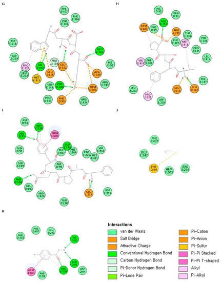 2D diagrams of bioactive peptides-MPO complexes. ELR (A), VGPQ (B), TDY (C), ALPAH (D), PAH (E), VDY (F), WSDK (G), VFSP (H), FAPQY (I), thiocyanate ion (J), and 4-aminobenzoic acid hydrazide (4-ABH) (K).