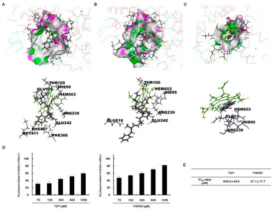 To confirm the in silico prediction results on the docking of peptides to MPO, in vitro MPO inhibition effects of the peptides were assessed. Both TDY and FAPQY inhibited MPO in a concentration-dependent manner, and the IC50 values were calculated to be 646.0 ± 45.0 µM and 57.1 ± 17.7 µM, respectively (Figure 6D,E). These results indicated that these bioactive peptides possessed the values of the natural MPO inhibitors. MPO promotes oxidative stress by involving the generation of radicals []. As with many radical species, H2O2 can cause the oxidative stress, directly reacting the cells and/or indirectly inducing the production other radical species. Especially, the hypohalous acids were produced by the MPO with H2O2; these radicals cause the stronger oxidative stress. In addition, the scavenging of H2O2 affects to inhibit the MPO activities. Thus, the components having both H2O2 scavenging activity and MPO inhibition effects can be considered as valuable antioxidant. Therefore, the protamex-assisted extracts and peptide from T. cornutus having both H2O2 scavenging activity and MPO inhibition effects can be used as functional food components for human health.