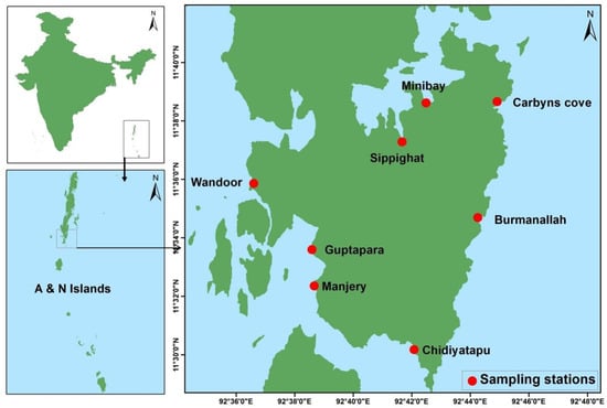 Mangrove ecosystems are present in the intertidal areas of tropical and subtropical regions in the junction between marine and terrestrial ecosystems such as estuaries, lagoons, creeks, and bays []. The mangrove ecosystem is a ‘microbial paradise’, supporting a diverse group of microbes and play a major role in the transformation of organic matter into a nutrient supply to many organisms, and it acts as an intensive sink for CO2 [,]. Mangrove vegetation in the Andaman and Nicobar (A&N) Islands is spread both in seaward fringes and creek areas, with a total area of 604 km2 with only 3 km2 in the Nicobar Islands. The Islands have a high diversity of mangroves belonging to 13 families, 19 genera, and 38 species [] and are located about 1200 km away from the mainland of India. They consist of a chain of 836 islands that include islets and rocky outcrops of which 38 are inhabited. These islands are rich marine biodiversity under erratic weather conditions, which make them unique from other geographic places.