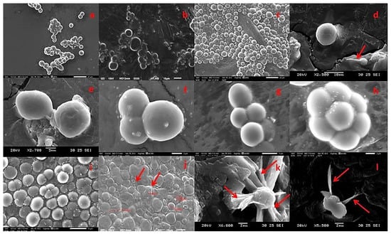 Developmental stages of thraustochytrids seen under scanning electron microscopic observation. (a) Vegetative cells in globose, (b) sub-globose, (c) spherical shape, (d) single mature vegetative cells and active zoospores, (e) vegetative cells dividing through binary cell division (diads), (f) group of three vegetative cells, (g) group of four vegetative cells (tetrads), (h) cluster of seven vegetative cells, (i) the vegetative cells can be seen any type of the growth of cells mature thallus, (j) larger amoeboid cells with reniform or ovoid shape zoospores, (k) The filaments of the ectoplasmic network, (l) zoospore with two heterokont flagella laterally inserted.
