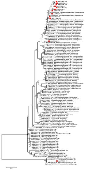 Molecular phylogenetic tree of thraustochytrid isolates compared with other related taxa. Branch distances represent nucleotide substitution rate and the scale bar represents the number of changes per nucleotide position. Thee red color circle and red color marking represent the thraustochytrids isolates (ANVKK-01-ANVKK-12) with the related GenBank submission numbers.