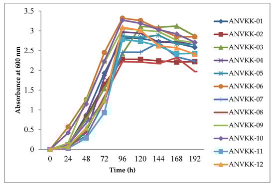 Growth curve characteristics of Andaman thraustochytrids isolates. The optimal culture conditions for screening the growth curve analysis were observed at 3 g·L−1 of glucose, 1.25 g·L−1 of yeast extract, and 1.25 g·L−1 of peptone, 7.2 pH, 28 psu salinity, 28 °C temperature, and eight days of incubation in 120× g maintained in an orbital shaker. The maximum growth was recorded in ANVKK-06 at 96 h.