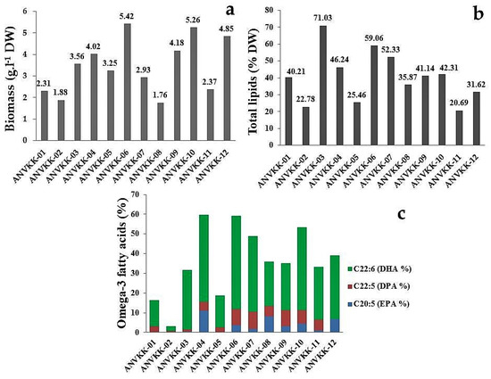 Lipid content varied from 20.69% to 71.03% of dry cell weight in 12 strains of thraustochytrids, with the maximum content (71.03%) in ANVKK-03 and the minimum (20.69%) in ANVKK-11. Six strains (ANVKK-03, ANVKK-04, ANVKK-06, ANVKK-07, ANVKK-09, and ANVKK-10) were found to be the high lipid producers with contents of 71.03%, 46.24%, 59.06%, 52.33%, 41.14%, and 42.31% of dry cell weight, respectively (Figure 6b). The major omega-3 PUFAs such as EPA (C20:5) was up to 11.03% in ANVKK-04; DPA (C22:5) was up to 8.65% in ANVKK-07; and DHA (C22:6) was up to 47.19% in ANVKK-06 (Figure 6c). In general, Aurantiochytrium and Schizochytrium are known to have high content of lipids and the level of fatty acids is reported to vary with strains/species and culture conditions. The major saturated fatty acid is palmitic acid (16:0), while the omega-3 polyunsaturated fatty acids such as EPA and DHA constitute 70 to 90% of total fatty acids [].