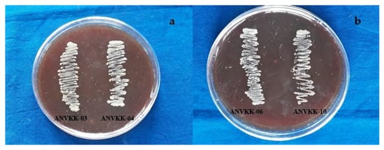 Blood agar hemolytic activity of Andaman thraustochytrid isolates. (a) ANVKK-03 and ANVKK-04, (b) ANVKK-06, and ANVKK-10 showed the absence of clear zone and color transparency around the colonies revealed that there was no blood lysis activity.