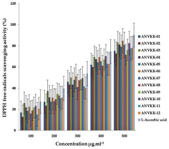 The antioxidant activity of the methanol extract of 12 thraustochytrids was evaluated by the DPPH radical scavenging assay and compared with L-ascorbic acid, which was used as the positive control. The results are shown in Figure 8. The DPPH free-radical scavenging assay was significant between thraustochytrids and the scavenging activity also increased with an increase in the concentrations of their extracts (p < 0.05) and this is in agreement with an earlier report on other species of thraustochytrids [,]. The activity was visually noticeable as the color changed from purple to yellow. ANVKK-06 exhibited the highest radical scavenging activity (84.79 ± 2.30%); whereas ANVKK-08 and ANVKK-02 showed a low scavenging activity of 71.65 ± 1.00% and 72.72 ± 1.15%, respectively (Figure 8).