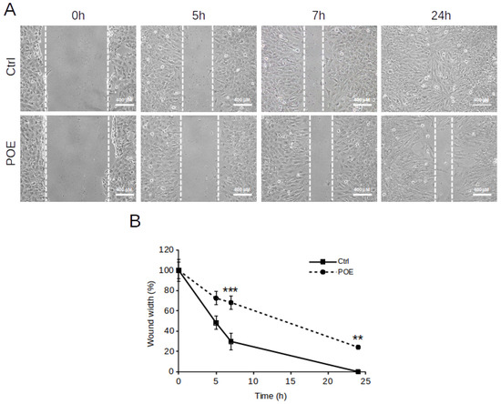 Effect of POE on SH-SY5Y cell migration. (A) Wound healing assay on SH-SY5Y cells treated with 70% (v/v) EtOH (Ctrl) or treated with POE (7.2 μg/mL). Scratch closure was monitored up to 24 h. Dashed lines mark the edges of the wound area. (B) Time course analysis of scratch closure in POE-treated cells or control cells. Wound width values were measured by considering the horizontal distance between the initial scratch and the scratch after migration at different time points. Values are represented as means ± SD from three different experiments. ** p < 0.01; *** p < 0.001 vs. Ctrl. Tukey’s test.