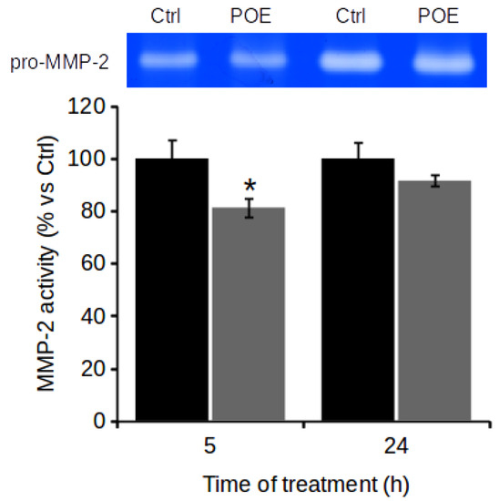 On the basis of the wound healing assay results, it was decided to investigate the MMP-2 activity in culture media collected after 5 h and 24 h POE treatment-time points at which POE showed anti-migratory activity. Cells treated with 70% (v/v) EtOH vehicle were used as controls (Ctrl). Gelatin zymography assay showed that SH-SY5Y cells with a migratory phenotype did not show active MMP-2 even under control condition. Instead, POE was found to cause a reduction in pro-MMP-2 activity of approximately 20% compared to control cells as early as 5 h of treatment (Figure 3). Even though minimal, this difference was statistically significant. Even though the amount of pro-MMP-2 released into the culture medium at 24 h was greater than that released at 5 h, irrespective of treatment, the inhibitory effect of POE on pro-MMP-2 activity tended to wear off at 24 h of treatment. At 24 h, pro-MMP-2 activity in POE-treated cells was comparable to that in control cells.