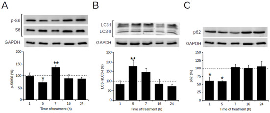 Furthermore, the literature reports that cell migration is a finely regulated process, and that autophagy may have a control over it [30,33,34,35,36]. In this work, the possible relationship between POE-induced inhibition of cell migration and autophagy activation was tested. The expression of key autophagy markers in POE-treated SH-SY5Y cells was monitored over time, and in particular the effect of POE on the autophagy mTOR-dependent pathway was investigated [44]. Western blot results showed that expression levels of the S6 phosphorylated form (p-S6), a downstream substrate of mTOR, underwent a transient and significant reduction in POE-treated cells. The resulting activation of autophagic flux was confirmed by the concomitant increase in the levels of LC3-II/LC3-I, an index of autophagosome formation and reduction in the levels of p62, a marker of the final step of autophagic degradation.