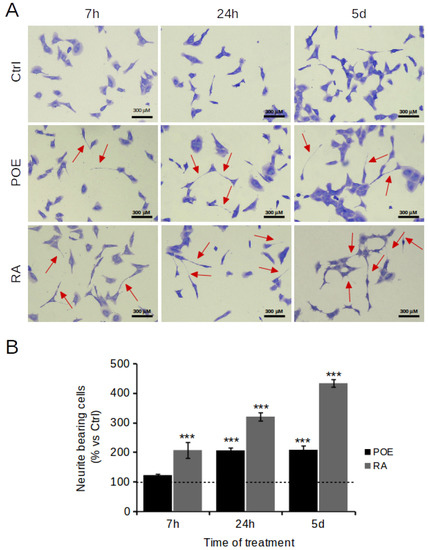 Initially, the effect of POE on neurite outgrowth, a reliable feature of neuronal differentiation, was evaluated [38]. Neurite extension was measured in this study using a neurite outgrowth assay. After treatment with POE (7.2 μg/mL) in differentiating medium, SH-SY5Y cells showed distinct morphological changes consistent with neuronal differentiation, as evidenced by the development of long branching neurites (Figure 6A). The number of POE-treated cells bearing neurites was increased as early as 7h of treatment (122 ± 5%) to double at longer times—i.e., 5 days of treatment—(206 ± 5%) compared with untreated control cells (Figure 5B). The effect of POE on neurite outgrowth resembled that of retinoic acid (10 μM), although retinoic acid—a known and potent differentiating agent—induced up to 4-fold more neurites at 5-days treatment (433 ± 13%) compared with untreated control cells (Figure 6B).