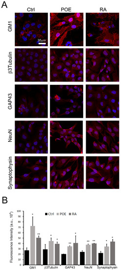 By immunofluorescence analysis, it was observed that POE resulted in the increase of some of the key markers of neuronal differentiation—i.e., GM1, β3Tubulin, GAP43, NeuN, Synaptophysin—compared to control cells, while maintaining a morphological profile similar to that of RA-treated cells.