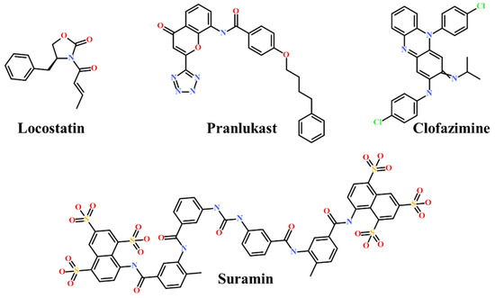 Presently, only a few small molecules have been identified to modulate RKIP’s role in pathological illnesses by binding to its conserved ligand-binding pocket. This pharmacological modulation has been accomplished through drugs encompassing Locostatin [18,19], pranlukast [20], clofazimine [21] and suramin [22] (Figure 1). The non-antibacterial oxazolidinone derivative, UIC-1005, was identified as a cell sheet migration inhibitor of RKIP [23] and later renamed as locostatin after its capability to inhibit cell locomotion in multiple systems [24]. In particular, locostatin abrogates the ability of RKIP to interact with Raf-1 kinase and also with GRK2, thereby functioning as a protein–protein interaction inhibitor [18,19]. Additionally, Sun et al. reported a novel RKIP-binding ligand, pranlukast, via structure-based virtual screening and demonstrated its binding on the conserved ligand-binding RKIP pocket through NMR and fluorescence experiments [20]. Guo et al. and team additionally identified Clofazimine and Suramin binding to RKIP through a combination of NMR and molecular docking [21,22].